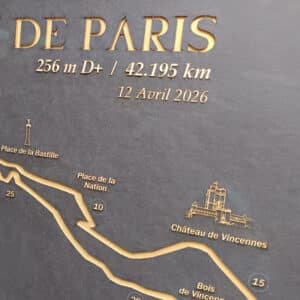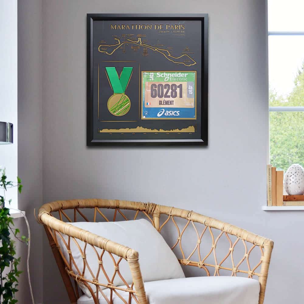 Pour cette édition du Marathon de Paris 2026, nous te proposons de garder un souvenir unique de ta course. Découvre ce cadre spécialement imaginé et conçu pour mettre en avant ta médaille de Finisher et ton dossard.