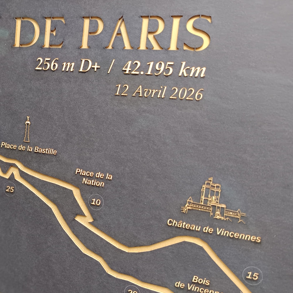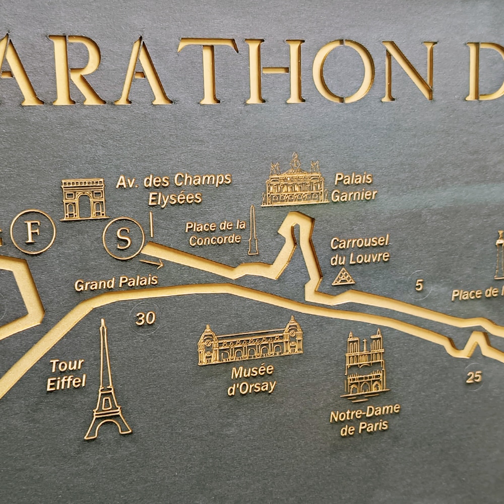 100% artisanal et Made In France, ce cadre est composé d’un fond noir gravé et découpé afin d’y insérer parfaitement ta médaille et ton dossard, et ainsi donner un maximum de relief au profil de ta course.